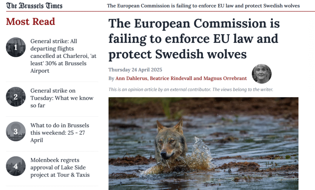 Det intensiva påverkansarbetet för att rädda vargen fortsätter oförtrutet på flera fronter. För att skapa ytterligare tryck på EU-kommissionen har Svenska Rovdjursföreningen tillsammans med Naturskyddsföreningen gjort inlägg i debatten genom en artikel publicerad i The Brussels Times, Belgiens största dagliga nyhetsmedia på engelska, med över 2 miljoner besök per månad.