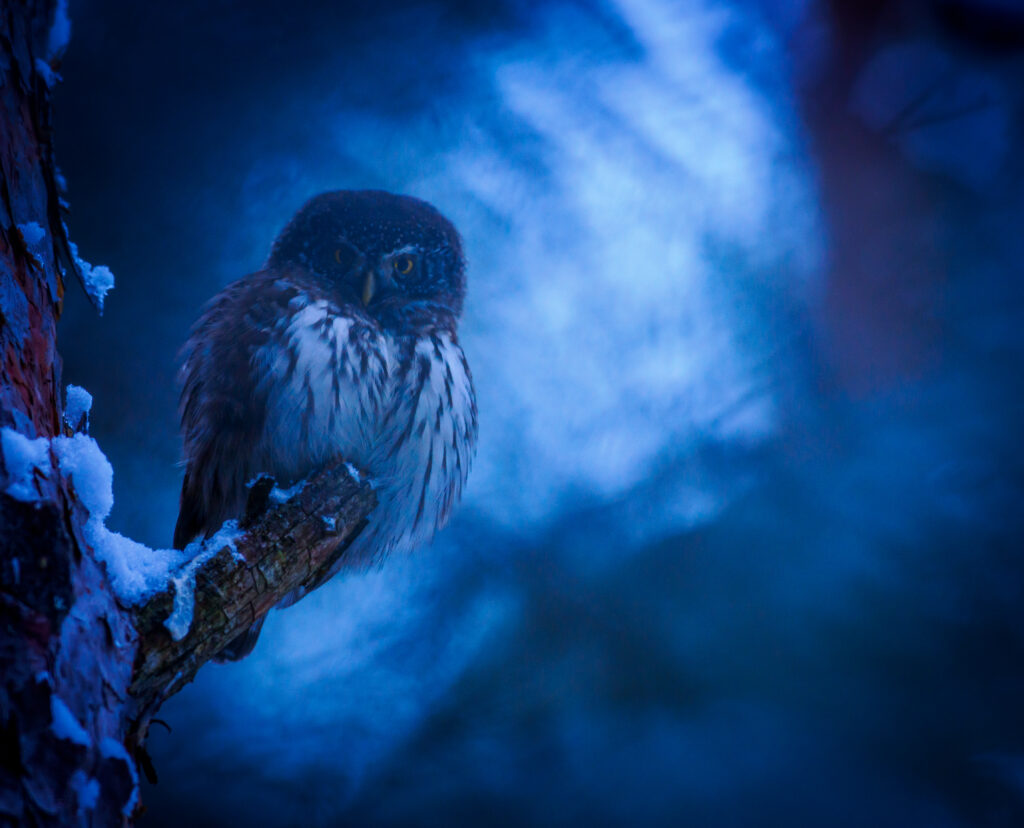 Försiktigt och helt ljudlöst sparkar den lilla ugglan med sina tarsar, en tars i taget, fram och tillbaka för att få bort snön från tallgrenen den sitter så stilfullt uppepå. Därefter ger hon ifrån sig några små visslande rop innan hon försiktigt sluter ögonen en liten stund. Det är tydligt att hon är medtagen av det stränga vintervädret. Jag gör några bilder till på den blundande sparvugglan. En så fin liten rovfågel detta är, så uttrycksfull och charmig!