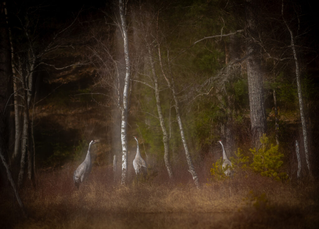 Min första tanke var att detta kanske var någon form av parningsritual som jag tidigare aldrig upplevt och att jag kanske kunde få en bild på något väldigt unikt här och nu. Jag började att komponera min bild och tänkte att detta nog kunde bli riktigt vackert i det fina morgonljuset. Precis i samma ögonblick som jag gjorde min dubbelexponering (en bild med skärpa och en i oskärpa, som automatiskt läggs samman till en bild i kameran) på tranorna så såg jag att något rörde sig i skogen bakom dem.