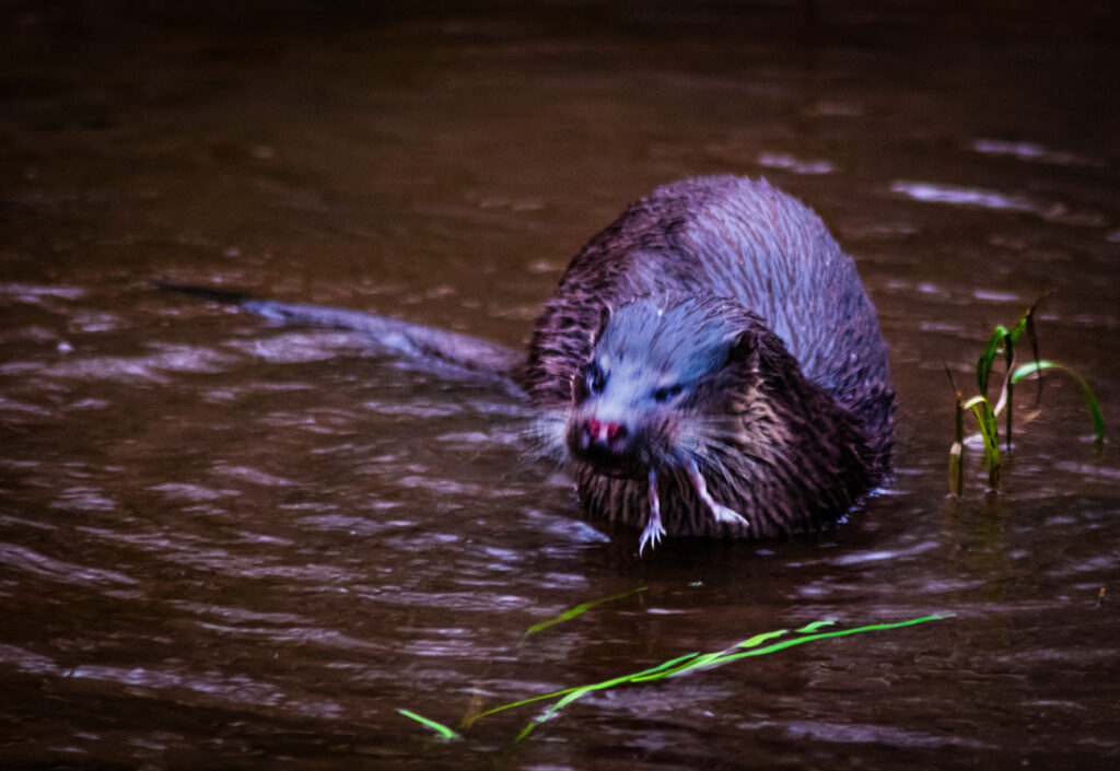 Precis som på hygget var allt lugnt och stilla även här, inte en krusning syntes på den spegelblanka ytan. Men så plötsligt började vattnet att röra på sig. Det kom en våg som var formad som ett ”v” farandes fram genom den lilla bäcken i riktning mot mig på bron. Något dök sedan ned i det kolsvarta vattnet, samtidigt som den v-formade vågen försvann från vattenytan. Det prasslade och rörde sig på land en bit längre bort. Men vad sjutton är detta!? sa jag tyst för mig själv. Kanske var min hjärna så inställd på att jag skulle få se en bäver komma simma här i den lilla ån, vilket såklart inte är särskilt konstigt efter alla timmarna under sommaren, då jag suttit här och spanat. Det tog ganska lång tid innan jag insåg att det faktiskt var en utter som kom simmandes i vattnet.
