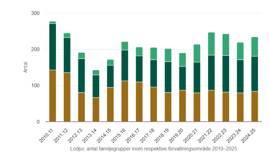 Under inventeringsperioden 2024/25 dokumenterades det 325 familjegrupper av lodjur i Skandinavien. Detta är en ökning med 29 familjegrupper jämfört med 2023/24. Av dessa 325 familjegrupper fanns 91 i Norge och 234 i Sverige.