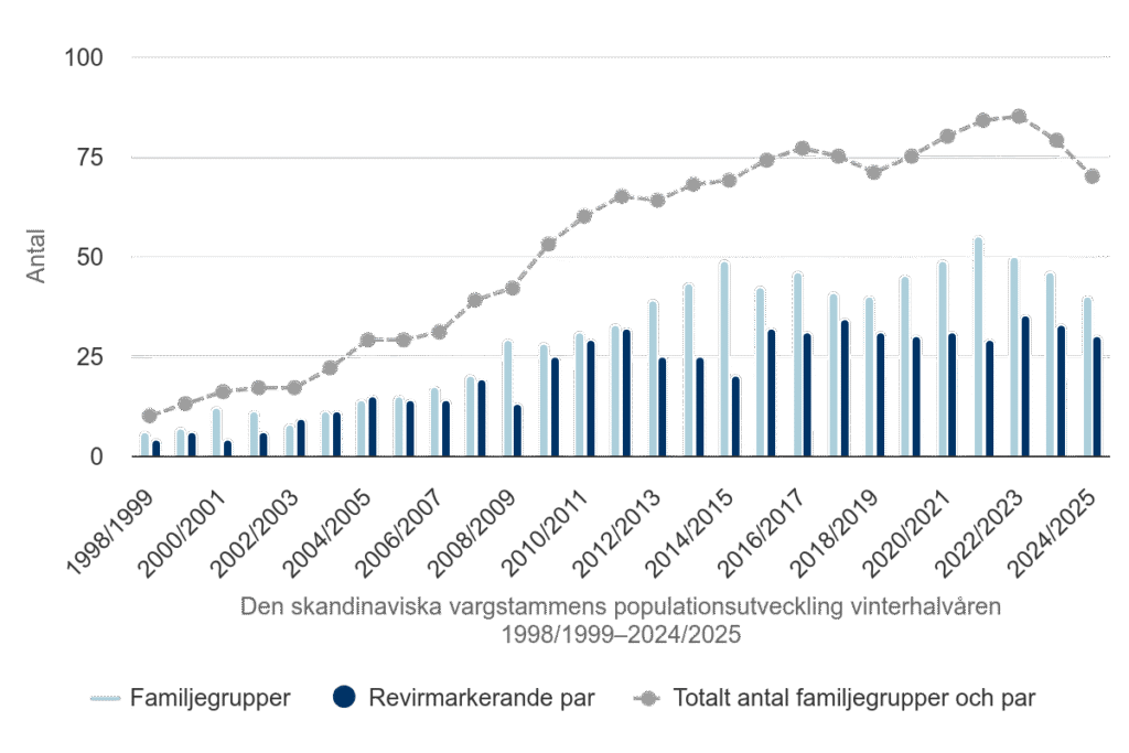 När inventeringsresultatet för 2024/2025 publicerades den 2 juni konstateras att vargstammen återigen har minskat. Resultatet visar att det under inventeringsperioden funnits cirka 400 vargar i Skandinavien (Sverige+Norge), 355 av dem i Sverige. Det är en minskning jämfört med förra vintern då inventeringen visade cirka 375 vargar i Sverige.