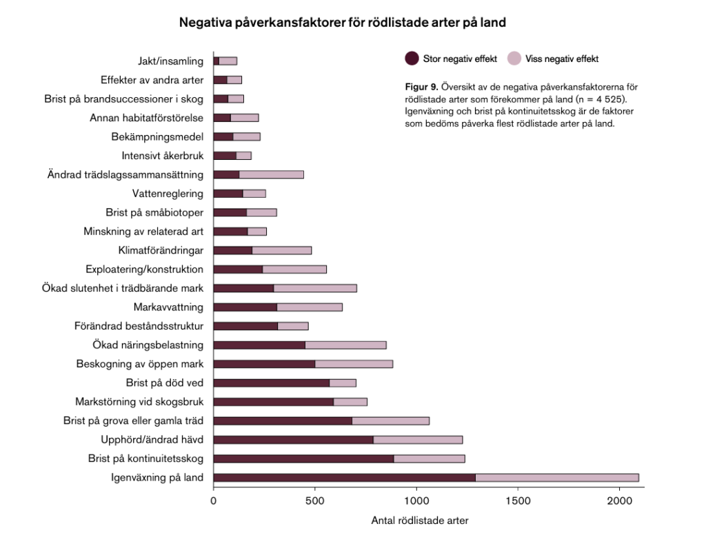 De främsta hoten för havslevande djur är enligt SLU generellt ökad näringstillförsel och bottentrålning För landlevande djur är igenväxtning och brist på naturskog under längre sammanhängande perioder de största problemen. Dessa faktorer påverkar drygt 40 procent av alla rödlistade arterna negativt. Igenväxtning har stark koppling till samhällsutvecklingen med bland annat minskning av betesmark, ökad näringstillförsel från jordbruk, avlopp, industrier, trafik och luftföroreningar. Förändrad markanvändning kan också orsaka igenväxning, till exempel efter dikning, täta trädplanteringar och vattenreglering.